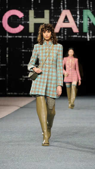 The color palette was inspired by the River Tweed, located on the border of England and Scotland. Chanel also took their inspiration a bit further and added it to the runway having it in pale green and in the venue by adding pops of color and having the backdrop printed with a tweed pattern. The historical context of tweed and the connection to the brand is that Gabrielle Chanel borrowed tweed from menswear in the 1920s and created beauty with the textile.