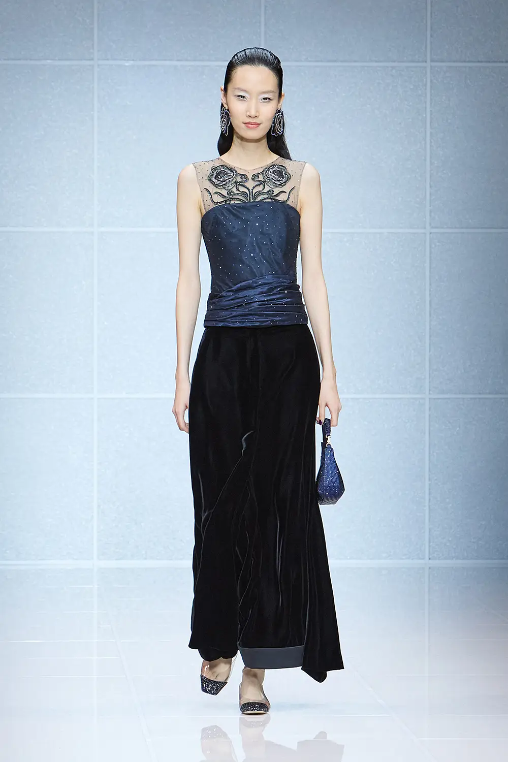 This evening wear-focused series focused on wide-legged trousers, boxy jackets, floral/sequin embellished caps, and blazers. It was a playful combination that evoked the spirit of vintage Armani: incredible structuring, movement, and fluidity.
