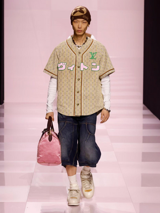 This time, we're not talking about candy pink or chick yellow, but cherry blossom pink and yuzu yellow. The color pantone also includes brown, color of the year, as well as more sober shades such as navy blue, beige, gray and black and white. In addition to the contemporary dandy style, the show borrowed inspiration from Japanese culture. This can be seen in the sleek, flared cuts of the garments and the denim inserts reminiscent of boro (Japanese denim patchwork).
