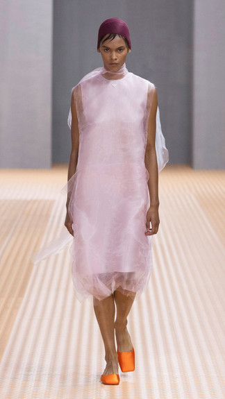 Prada showcased transparent organza dresses that appeared to flow down the catwalk against the breeze like waves of freedom and fringed fabric skirts with skin-tight headwear color matched perfectly to every design. Distressed flower adorned shirts and oversized workwear jackets with leather collars and golden hardware debuted this season, paying homage to the standard uniform. Gold-foiled skirts and tasseled layers gave an exciting party vibe and a feeling of freedom to move, while pierced shirting and knee-length dresses were adorned with bedazzled ornamentations.
