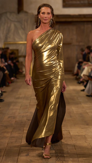 Finally, the fashion show showcased a series of black and gold ensembles, offering an opportunity to experiment with the brand's signature elements. The showstopper was Christy Turlington's gold one-shoulder gown, which closed the show in sophistication.