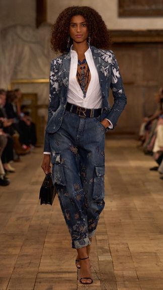 The spring 2024 collection embraces a new era of Ralph Lauren's distinctive style by venturing into uncharted territory. It commenced with the quintessential American fabric, denim, being elevated to a new level. Denim was adorned with chiffon and tulle linings, transformed into devoré patterns, and embellished with an abundance of sequins and beads. Describing these creations as couture doesn't seem like an overstatement, even though the designs themselves featured simple jacket and cargo pants silhouettes.